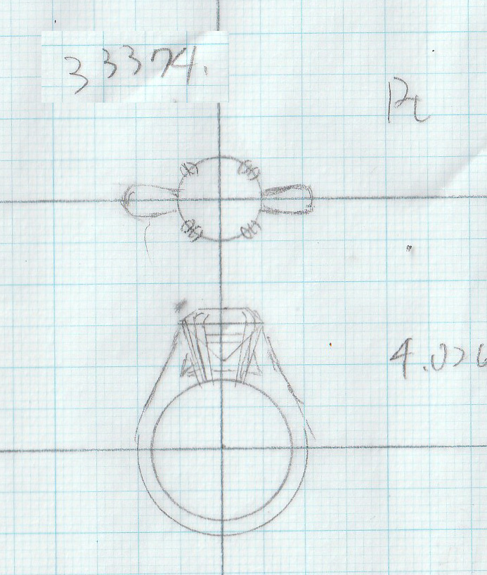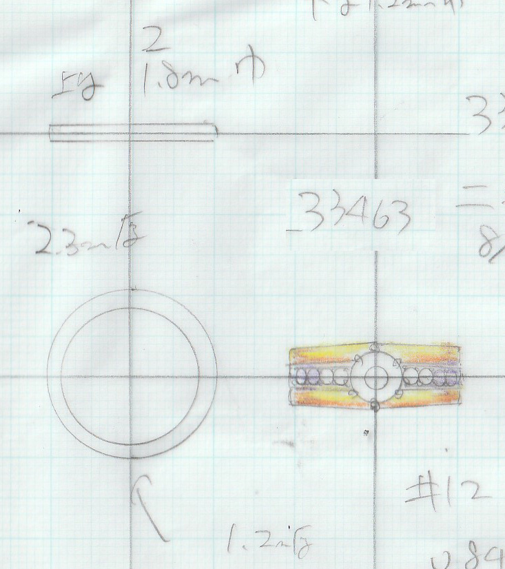 お指の周りのどれくらいまでダイヤが取り巻くことになるかな?と図面を描いてみたところ、四分の三くらいまでダイヤが取り巻きまして、贅沢かつさりげない指輪にリフォームできました。