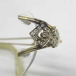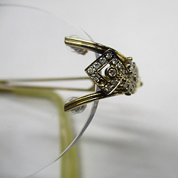 メガネの両側のフレームから、1つずつダイヤが外れてしまったようです。おば様から譲り受けられたメガネで、レンズは目にあわせて交換してもらいましたが、フレームの変色クリーニングと石外れは対応してくれなかったので修理できないかというご相談でした。