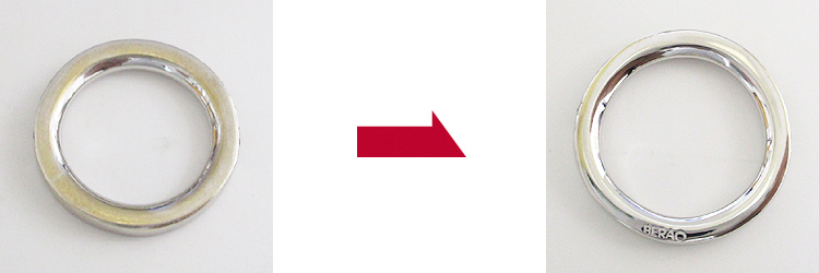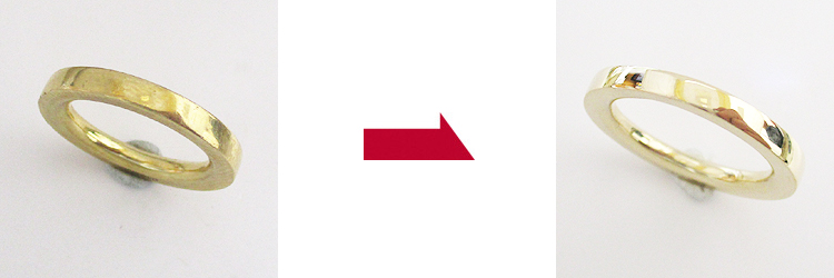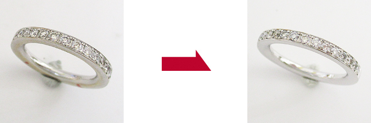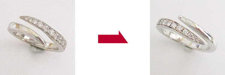 指輪の上半分にダイヤモンドが入り、腕直下の側面にはブランドロゴが刻印されています。通常サイズ直しはブランドロゴ付近で足してお直しするのですが、ブランドロゴが消えないように、位置もずれないように何とかお直しさせていただくことができました。