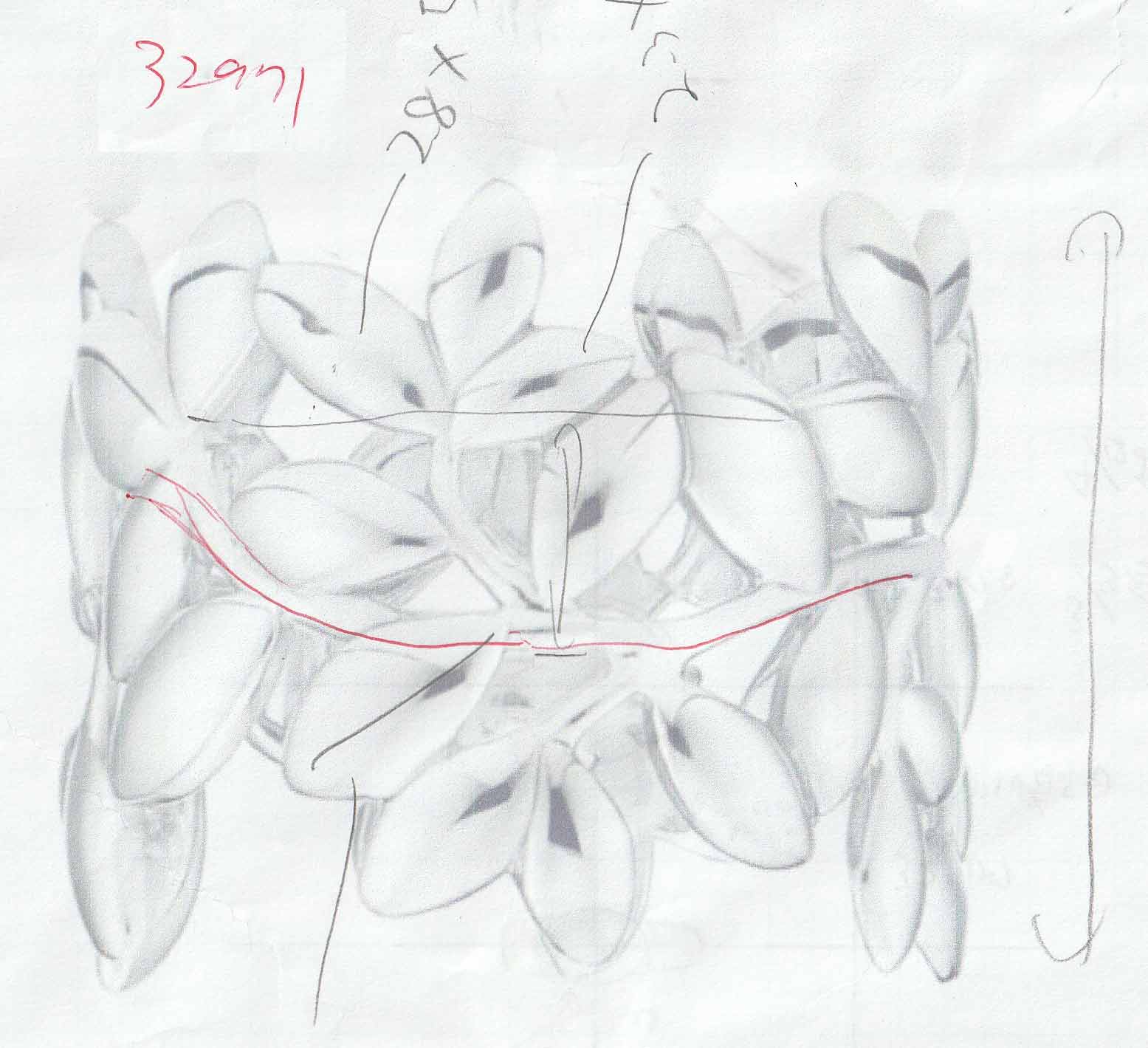 デザインのラフ画を3・4パターン大まかに書いていきます。方向性が定まりましたら実寸でデザイン画を書きます。