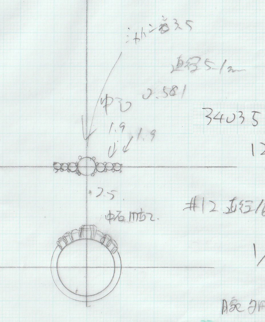 オーダーリフォームするときには、ダイヤを採寸し、図面にします。図面にすることが目的ではなく、より理解を深めるために図面化します。大きさとデザイン、立体、裏側など、3面図で書くと正面図だけでは理解できない矛盾点がたくさん出てきます。