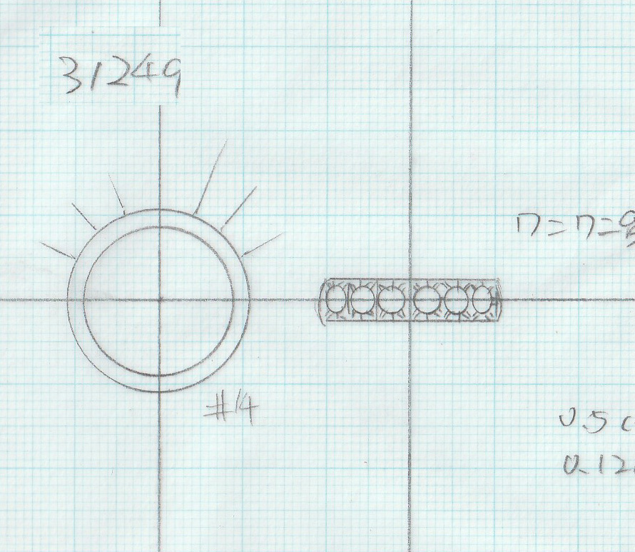 今回この5石リングのダイヤ、採寸すると0.15ct3.5ミリで、ほぼ同じ大きさでした(一文字リングはたいがい真ん中の石が大きいのですが)。なので、石座をCADで作って製作することになりました。