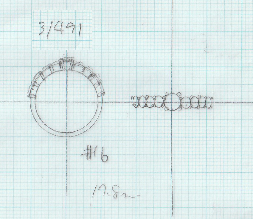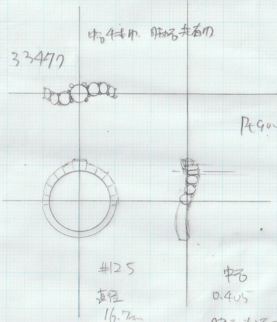 この指輪は、指輪を作る伝統的な技法、「飾」で作らせていただきました。中石の大きなダイヤと、何気なくサイドに3石ずつ、6石並べていますが、均等に自然に見えるように間を作って、バランスよく見えるように制作しました。いわゆる「職人さん」は、このような仕事をしたい(このようなことを書くだけで職人さんには怒られるかもしれない)。