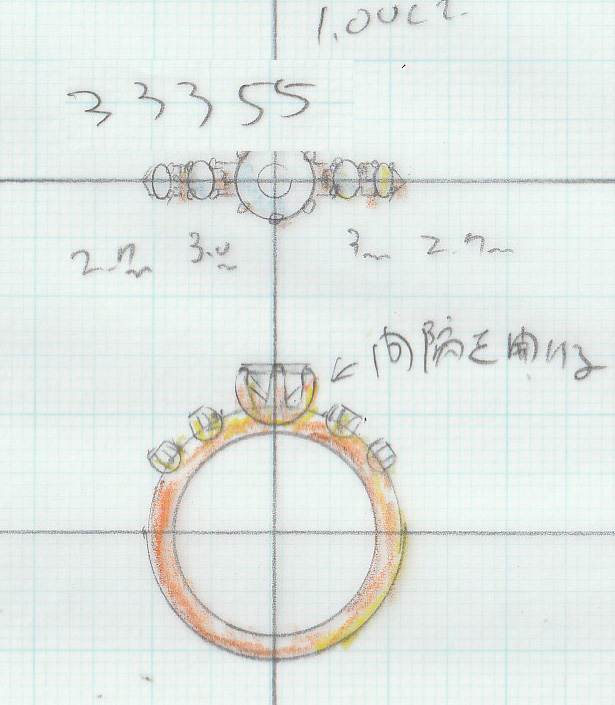 お客さまからデザインスケッチをいただきまして、それをもとにデザインを2つ3つ起こして描き、選んでいただきました。そしてお選びいただきましたのが、こちらのデザインです。真ん中に立爪のダイヤ、両端に5石ずつエタニティリングのダイヤをあしらいまして、幅のあるしっかりしたデザインの指輪にリフォームさせていただきました。