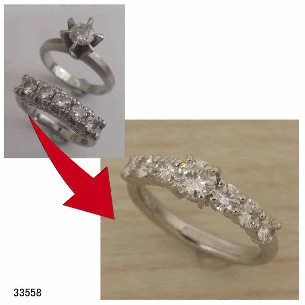 Ptダイヤリング2本を1本にリフォームさせていただきました。立て爪0.45ctダイヤモンドと5石で0.73ctダイヤリングを合わせました。真ん中のダイヤの両サイドに3石づつになるように1石足してリフォームさせていただきました。立て爪ダイヤは少しでもダイヤモンドを大きく見せようと爪が大きく高さがあり、それに合わせる5石ダイヤリング(一文字リングといいました)も背が高くお世辞にも使いやすいとは言えないデザインでした。これらのダイヤモンドを合わせて高さを低く使いやすくてシンプルに「今」