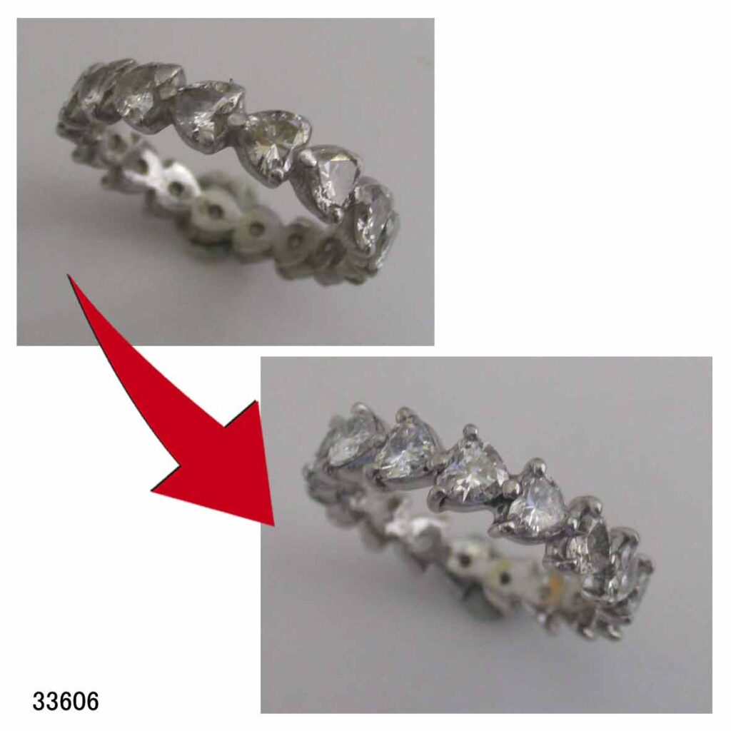 Ptダイヤリング2本を1本にリフォームさせていただきました。立て爪0.45ctダイヤモンドと5石で0.73ctダイヤリングを合わせました。真ん中のダイヤの両サイドに3石づつになるように1石足してリフォームさせていただきました。立て爪ダイヤは少しでもダイヤモンドを大きく見せようと爪が大きく高さがあり、それに合わせる5石ダイヤリング(一文字リングといいました)も背が高くお世辞にも使いやすいとは言えないデザインでした。これらのダイヤモンドを合わせて高さを低く使いやすくてシンプルに「今」