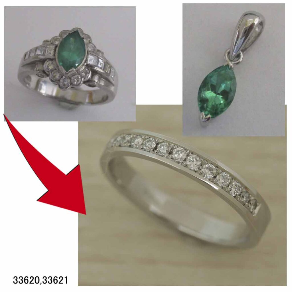 Ptダイヤリングハーフエタニティリングリフォームをさせていただきました。中石のエメラルドはペンダントにさせていただきまして、残りのダイヤとプラチナでリフォームさせていただきました。プラチナの重量から3.5ミリ幅、1.5ミリ厚、サイズ21号のしっかりした指輪の出来上がりを算出しリフォームしました。ダイヤモンドは14石石留めしまして立派な指輪にリフォームさせていただきました。豪華な指輪をシンプルなペンダント指輪にリフォームするリフォームだなぁと思いました。あなたのジュエリーのお悩みを解決します。エタニティリングリフォーム→https://j-ihara.jp/new_site/ordermade_jewelry_eternity.html