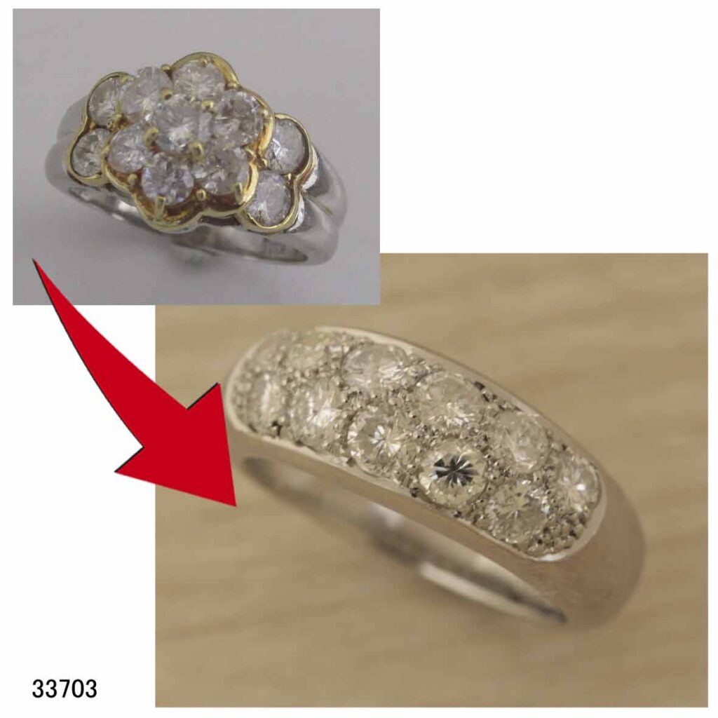 Ptダイヤリングリフォームをリフォームさせていただきました。おおよそ3,40年前に作られた華やかなデザインのダイヤリングを幅広のパヴェ(ダイヤモンドを石畳のように敷き詰めた)リングにリフォームさせていただきました。大きさは結構バラバラで3.6mミリから3.0ミリまで11石1.5ctのダイヤモンドでリフォームさせていただきました。毎日ブログを読んでいただいてるというお客さま誠にありがとうございました。あなたのジュエリーのお悩みを解決します。多数石ダイヤモンドリフォーム→https://j-ihara.jp/new_site/order-reform_special-dia.html