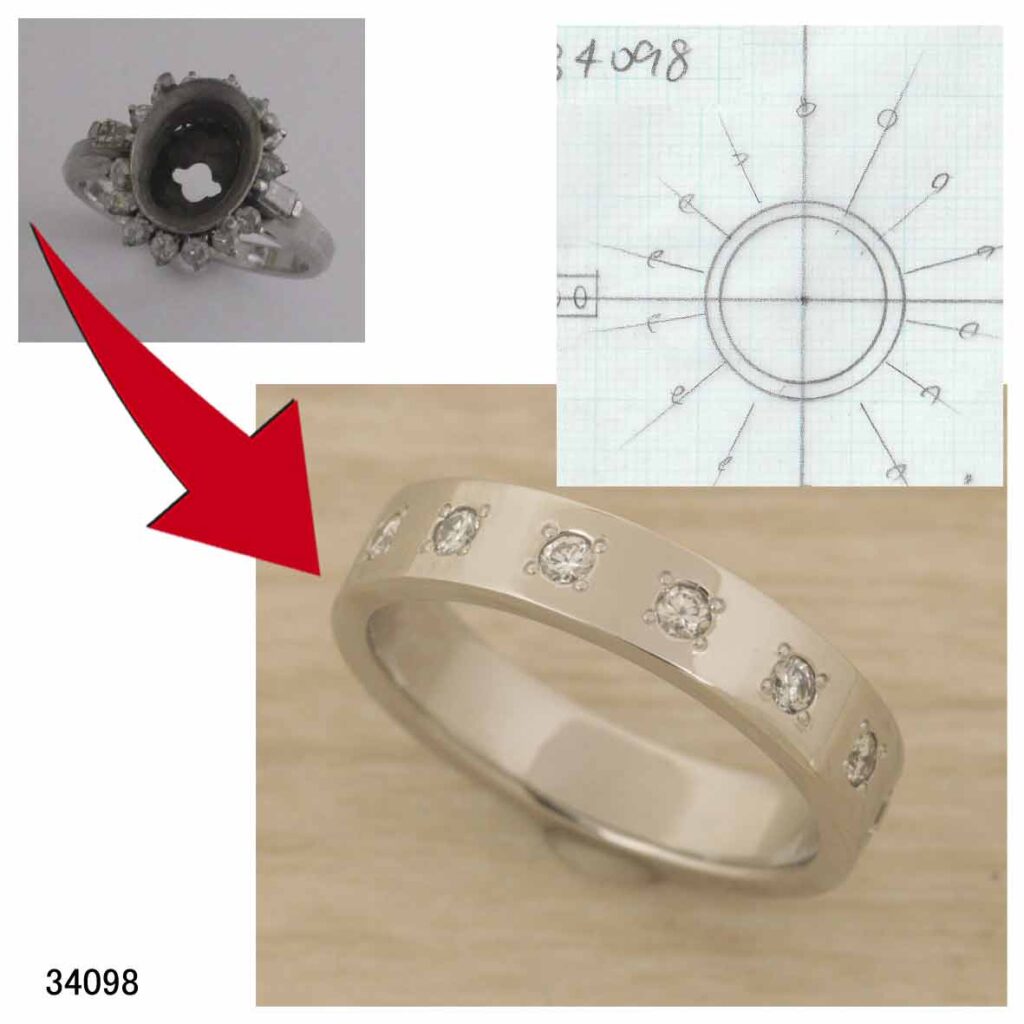 Ptダイヤエタニティリングにリフォームさせていただきました。中石は何かにリフォームされたのでしょう。プラチナダイヤの枠をお持ちいただきました。何かにリフォームできないかのご相談でございました。いくつかデザインを提案させていただきまして、エタニティデザインを選んでいただきました。このデザインでございましたらプラチナ枠を溶かして指輪を作りましてそこに14石等間隔にダイヤを石留めさせていただきましてリフォームさせていただきました。遠いところご来店いただきましてありがとうございました。あなたのジュエリーのお悩みを解決します。エタニティリングリフォーム→https://j-ihara.jp/order_eternity-ring.html