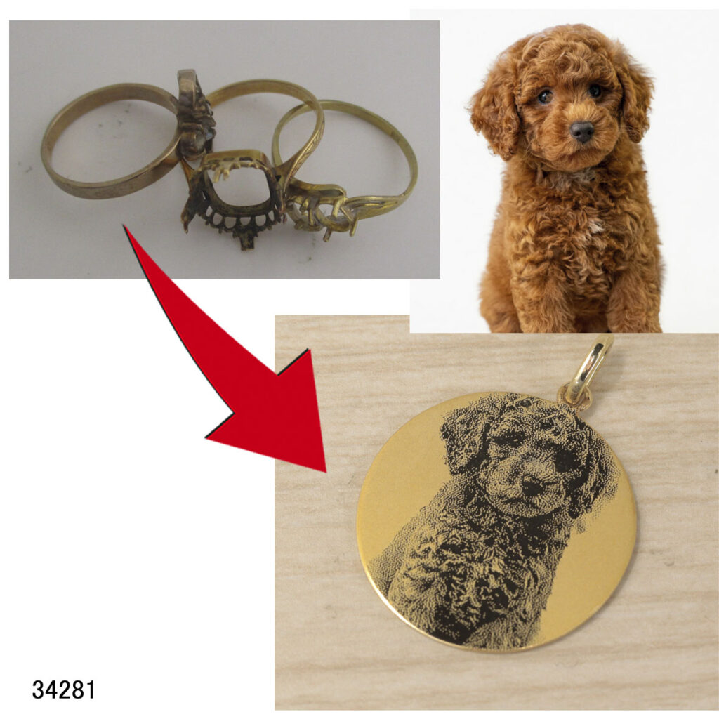 K18ワンちゃんの写真をペンダントに彫りこんでリフォームさせていただきました。とてもかわいいトイプードルのワンちゃんをペンダントにリフォームさせていただきました。この度はお客さまの使わなくなった18金を溶かしてペンダントプレートにしてそこにトープードルのワンちゃんを彫り込みました。伝統的な技術と最新のレーザー技術を合わせてリフォームさせていただきました。今迄からこの技術は合ったのですが、今回機材を新導入して臨みました。今までは外注作業でお願いしていたのですが、レーザー技術を使いこなす職人さんがすぐに流出してしまうとのことでできる見込みは合ってもお受けできないことがありました。これからは工房内に機材がありますので気軽にできるようになりました。かわいいペットの写真を肌身離さず身に着けませんか?あなたのジュエリーのお悩みを解決します。オーダーペットジュエリー→https://j-ihara.jp/order_petjewelry.html