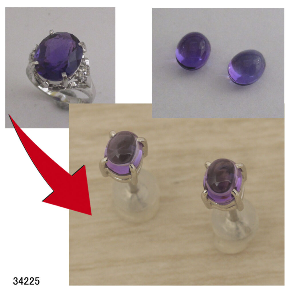 Ptアメシストピアスのリフォームをさせていただきました。お母さまから受け継がれたアメシストの指輪をピアスにされたいとのことでした。まずはアメシストのルースを宝石研磨職人さんにピアスに出来るようにカットしていただきます。お客さまの宝石をリカットしてリフォームすることはとても気を使います。大きな宝石を小さく切ると色調が変わります。そしてカットの種類が変わると表情も変わります。また、宝石というのは自然物なので最悪の場合意図せぬ割れ、欠けなどが生じる場合があります。私自身の宝石がかけてしまっても「しょうがないか」で済みますけど、お預かりした宝石がそのようになると大変なことになります。なので、お互いが信頼関係が築けるお客さま仕事しかお受け出来ておりません。なんとかうまくリフォームできましてとても喜んでいただきました。ありがとうございます。ピアスリフォーム→https://j-ihara.jp/order_pierce-earring.html
